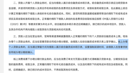 这里面明确提到:线上办理个人贷款业务的,应当通过弹窗方式向借款人展示综合融资成本明示表,设置强制阅读时间,由借款人在签署贷款合同或办理分期前确认。
